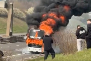 一輛載有球迷的大巴在英國一條繁忙的高速公路上起火燃燒,給前往觀看聯賽杯決賽的球迷造成交通混亂。這輛起火的大巴停在西米德蘭茲郡M6高速公路3號交匯處附近,據信車上載有曼城球迷。