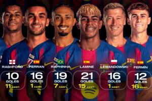 體育資訊03月23日訊 世體統計了巴薩球員本賽季的進球貢獻數據,亞馬爾以21球15助排在第一位,費爾明12球16助第二,拉菲尼亞19球7助第三。