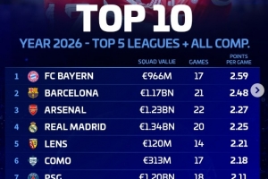 體育資訊3月24日訊 德轉盤點了2026年五大聯賽球隊在各項賽事場均積分榜,其中拜仁居首,具體如下: