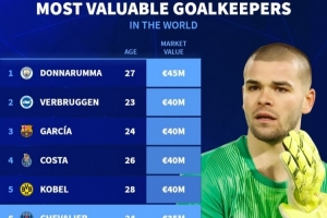 體育資訊3月25日訊 德國轉會市場統計了門將的最新身價,并列出榜單,多納魯馬4500萬歐居首,維爾布魯根、霍安·加西亞、迪奧戈·科斯塔、科貝爾4000萬歐。