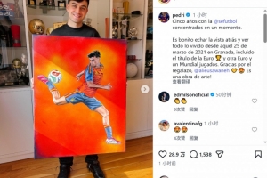 佩德里獲贈一幅畫作,內(nèi)容為他身穿西班牙國家隊(duì)球衣的形象,佩德里社媒曬出這幅畫作,配文:“西班牙國家隊(duì)的五年時(shí)光,所有回憶凝聚于此刻?;厥淄率嵌嗝疵篮?,自2021年3月25日在格拉納達(dá)的那個(gè)日子以來,我們經(jīng)歷了太多,包括一座歐洲杯冠軍,以及另外一次歐洲杯和世界杯的征程。感謝這份厚禮,這簡直是一件藝術(shù)品!”