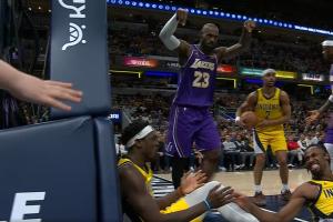 GIF-詹姆斯歐洲步 指著步行者摔倒的兩人嘲諷