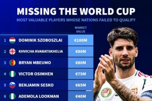 無緣今年世界杯球員身價排名(所在球隊未晉級,不包含附加賽球隊):