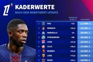 體育資訊3月28日訊 德國轉(zhuǎn)會(huì)市場更新了法甲球員的身價(jià),并列出法甲球隊(duì)身價(jià)排名,巴黎12.2億歐斷層居首,摩納哥3.92億歐次席。