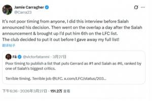 卡拉格回復這名球迷:“這絕非任何人的時機考量失當——我早在薩拉赫宣布決定前就完成了這次采訪。薩拉赫官宣的次日,我才在Overlap節目里展開后續話題,提到自己將他排在利物浦隊史榜單的第六位。可俱樂部在我公布完整榜單之前,就把這段內容發布了出去!”