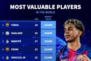 體育資訊03月30日訊 在更新多個聯(lián)賽身價后,德轉(zhuǎn)盤點當(dāng)前足壇身價TOP50。亞馬爾、哈蘭德、姆巴佩2億歐領(lǐng)銜,20人身價過億,意甲僅勞塔羅和伊爾迪茲進(jìn)入前50。