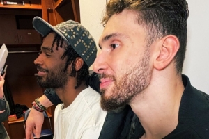 據記者曬照,申京賽后在更衣室摟著伊森接受采訪,后者則滿臉笑容。