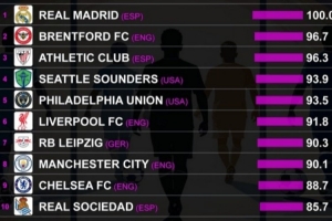 緊隨皇馬之后的是兩種截然不同但同樣高效的建隊模式。布倫特福德已鞏固為英超聯賽中最穩健的項目之一,以優化資源利用和維持穩定性見長。畢爾巴鄂競技則堅守其傳統本色,持續打造具有延續性和集體感的球隊。