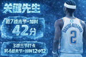 過去7戰,亞歷山大3次三節打卡,其余4場的末節和加時合計12中12,砍下42分。