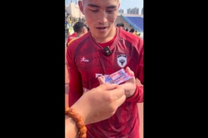 體育資訊4月1日訊 4月1日,2026泰山好水CMG群眾足球邀請賽小組最后一個比賽日,山東泰安隊2-2戰平青海玉樹隊,記者牛志明賽后向玉樹隊門將索南龍周贈送王大雷簽名照。