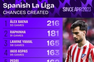 體育資訊4月2日訊 Squawka統計了亞馬爾2023年4月西甲首秀以來,球員在西甲創造機會的次數,并列出榜單,亞馬爾創造165次機會,僅少于巴埃納、拉菲尼亞。