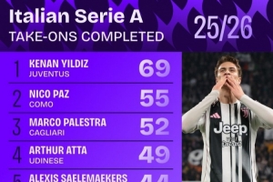 體育資訊4月3日訊 Squawka列出了本賽季意甲成功過人排名,伊爾迪茲69次居首,尼科·帕斯55次第二。