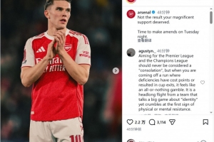 阿森納官方社媒曬出球員們謝場的照片,配文:“你們的傾力支持沒有換來應得的結果,周二晚上(客戰葡體),我們會彌補這一切。”