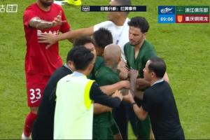比賽第88分鐘,浙江外援米特里策用手拉李鎮(zhèn)全頭發(fā),主裁查看VAR后直紅將米特里策罰下。米特里策非常憤怒,還想要沖上前去,隊(duì)友趕緊把他拉住。