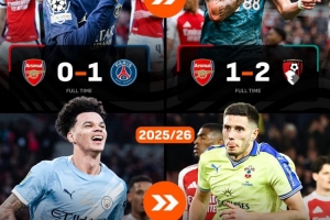 在接近1年的時間里,阿森納首次在各項賽事中遭遇連敗。2024-25賽季,阿森納曾在面對巴黎圣日耳曼和伯恩茅斯時遭遇連敗,分別以0-1和1-2的比分不敵對手。