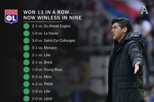 據TA統計,豐塞卡麾下的里昂此前取得13連勝,而2月中旬之后,里昂已經連續9場比賽不勝,戰績4平5負。