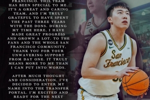 王俊杰寫道:“首先,我想感謝舊金山大學(xué)的教練和隊(duì)友們。這支球隊(duì)對(duì)我來說意義非凡,這是一個(gè)充滿關(guān)懷的偉大團(tuán)隊(duì)。我非常感激過去三年能夠與多恩隊(duì)共度時(shí)光。在這里的日子里,我取得了很大的進(jìn)步,也成長(zhǎng)了許多。對(duì)于球迷和整個(gè)舊金山社區(qū),從第一天起你們就給予了我堅(jiān)定不移的支持,這對(duì)我來說意義重大,難以言表。