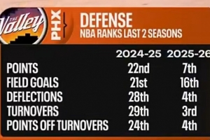 本賽季太陽在失分、對手進球數、場均干擾防守次數、造對手失誤、利用失誤得分等多項數據上,相比上賽季都有巨大提升,多項數據聯盟前列。