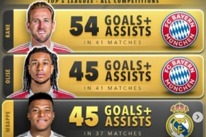 體育資訊4月8日訊 數據網站Score90盤點了本賽季五大聯賽球員在各項賽事總參與進球榜(進球+助攻),前五中拜仁占據三席,具體如下: