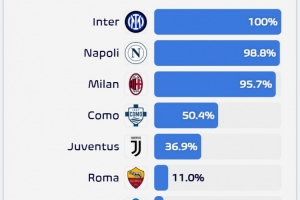 意甲各隊闖進前四概率:科莫50.4%,尤文36.9%,羅馬僅11%