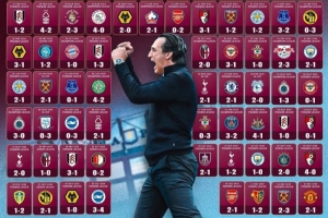 維拉在官方社交媒體上曬出埃梅里帶隊贏下100場勝利的海報,并列出了這100場比賽具體的對手和比分。