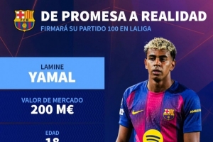 據(jù)德國轉(zhuǎn)會市場統(tǒng)計,如果18歲的亞馬爾此役出戰(zhàn),他將達成西甲100場比賽里程碑。