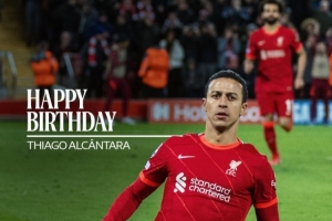 利物浦祝蒂亞戈35歲生日快樂,效力期間出戰98場3球6助