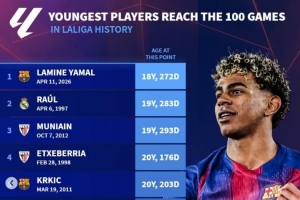 西甲最年輕百場榜:亞馬爾壓勞爾居首,加維、哈馬、阿圭羅在列