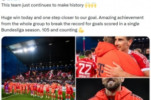 他也在賽后通過社媒曬出比賽照,并慶祝勝利:“這支球隊仍在創(chuàng)造歷史????今天取得重大勝利,離我們的目標又近了一步。全隊共同努力取得非凡成就,打破了德甲單賽季進球紀錄。目前已經105球了,而且還在繼續(xù)增加!”