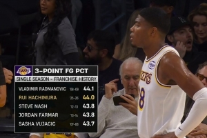轉(zhuǎn)播方給出了本賽季八村塁的三分命中率,為44%(本場比賽前),暫列湖人隊(duì)史第二高,僅次于弗拉迪米爾·拉德曼諾維奇的44.1%。