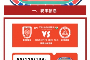 4月17日周五19:35,中超第6輪,重慶銅梁龍主場對陣深圳新鵬城的比賽在銅梁龍體育場進行,俱樂部官方發布本場票務信息,票價分為90元、120元、150元、200元以及300元5檔,開售時間為4月14日19點。