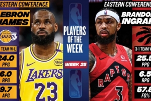 體育資訊4月14日訊 今日NBA官方宣布,湖人球星勒布朗·詹姆斯和猛龍球星布蘭登·英格拉姆分別被評(píng)為本賽季第25周西部和東部周最佳球員。