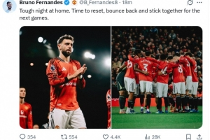 本場比賽B費送出精彩助攻幫助卡塞米羅破門,他也在個人社媒曬出本場照片鼓勵球隊,寫道:“主場經歷一場艱難的失利,現在是時候進行休整,我們會在下一場比賽團結一致重振旗鼓。”