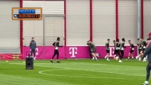 據西班牙六臺報道,拜仁今日在對陣皇馬比賽前的最后一次訓練中氣氛良好。在球員熱身時還有音響在球場中播放音樂。