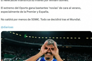 報道稱這位波爾圖邊鋒在夏季轉會窗口前吸引了眾多追求者,尤其是來自英超和西班牙的俱樂部。預計他的轉會費不會低于5000萬歐元。一切將在世界杯后決定。