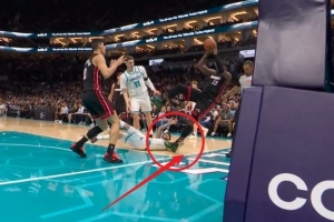 GIF-這動作不好!三球用手扒阿德巴約腳后跟致其倒地受傷,已回更衣室!