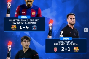 體育資訊4月15日訊 在歐冠淘汰賽次回合,巴薩2-1擊敗馬競,加西亞吃到紅牌,這是巴薩近3個(gè)賽季在歐冠吃到的第6張紅牌,以下為具體情況: