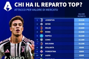 體育資訊4月16日訊 德轉按后衛+門將、中場、前鋒統計意甲各隊球員身價,前鋒球員總身價中,尤文以2.31億歐居首,國米第二,米蘭第三。