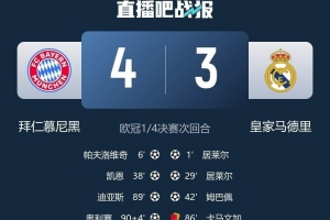 體育資訊4月16日訊 歐冠1/4決賽次回合,拜仁主場4-3逆轉擊敗皇馬,并以6-4的總比分晉級四強。
