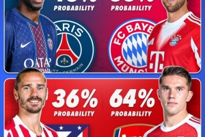 Score 90對4隊晉級決賽的概率進行了預測,拜仁55%,巴黎圣日耳曼45%,阿森納64%,馬競36%。