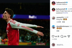 阿森納球員哈弗茨社媒曬出慶祝的照片,配文:“半決賽我們來(lái)了,迎接一個(gè)重要的周末。”