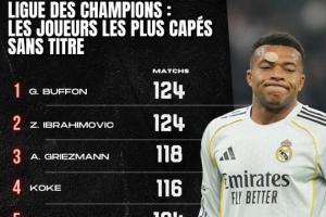 體育資訊04月16日訊 外媒《Onze Mondial》統計了未曾奪得歐冠冠軍的球員中,這些球員的歐冠出場次數排行,姆巴佩98場排在歷史第9位。布馮、伊布124場并列第一。