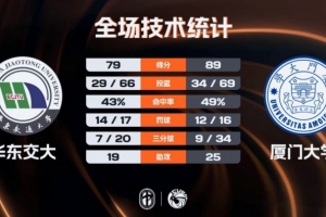 易邊再戰,華東交大的表現終于有所好轉,他們單節得分首次超過20分,分差也一度追回到個位數,但他們在本節的最后三分鐘時間里一分未得,廈門大學連拿7分穩住局勢,三節結束,廈門大學76-61領先華東交大。