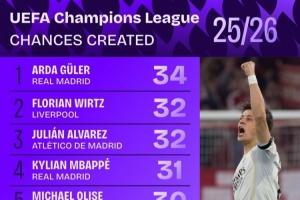 本賽季歐冠創造機會排名: