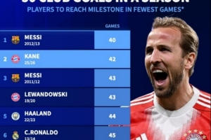 單賽季達成50球最快紀錄榜:梅西40場居首,凱恩本賽季42場次席
