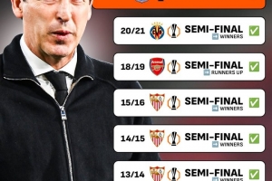執教以來,維拉主帥埃梅里已經7次闖進歐聯杯半決賽,他本賽季有望奪得第5個歐聯杯冠軍。除了率領維拉闖進歐聯杯半決賽外,埃梅里還曾率領瓦倫西亞、塞維利亞(3次)、阿森納以及比利亞雷亞爾闖進歐聯杯半決賽。