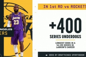 據(jù)ESPN統(tǒng)計(jì),湖人首輪戰(zhàn)勝火箭晉級(jí)的賠率為+400(投注100,若押中連本帶利得500),這是詹姆斯生涯其所在球隊(duì)在季后賽首輪的最差賠率。
