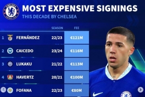 切爾西近年引援榜:恩佐壓凱塞多居首,盧卡庫、哈弗茨均上億