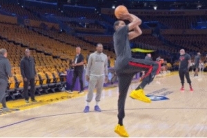 賽前,杜蘭特進(jìn)行熱身,看來膝蓋傷勢(shì)并不嚴(yán)重。