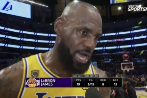 體育資訊4月19日訊 今日,湖人在季后賽首輪G1中107-98主場擊敗火箭,系列賽1-0領先。賽后,湖人球星詹姆斯接受了采訪。